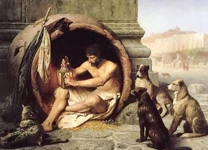 Diogenes lived like a tramp, sleeping in a tub in the street, begging, going to the toilet unceremoniously when the urge required it. He also pleasured himself in public in the market square, observing he wished he could ease his hunger as easily by rubbing his stomach.